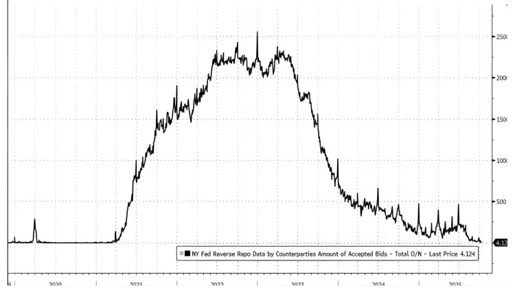Il grafico del Federal Reverse Repo. Questo strumento è la cisterna dove le banche e le istituzioni finanziarie parcheggiano la liquidità in eccesso, guadagnando un interesse sicuro dalla FED. Per anni, quella cisterna era stracolma, con oltre 2.000 miliardi di dollari. Oggi, come potete vedere, è quasi vuota. La liquidità in eccesso è finita. Prosciugata.